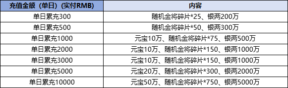 2.充值档位单日累充额度可叠加领取,取最高档及以下所有档位如:单日累计充值1000元,可享有300、500、1000元档位奖励;