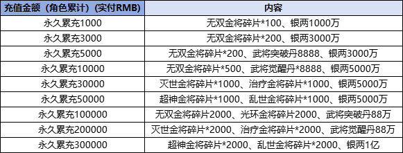 2、累充奖励每个档次单个角色终生仅可领取一次,充值满足条件角色领取;
